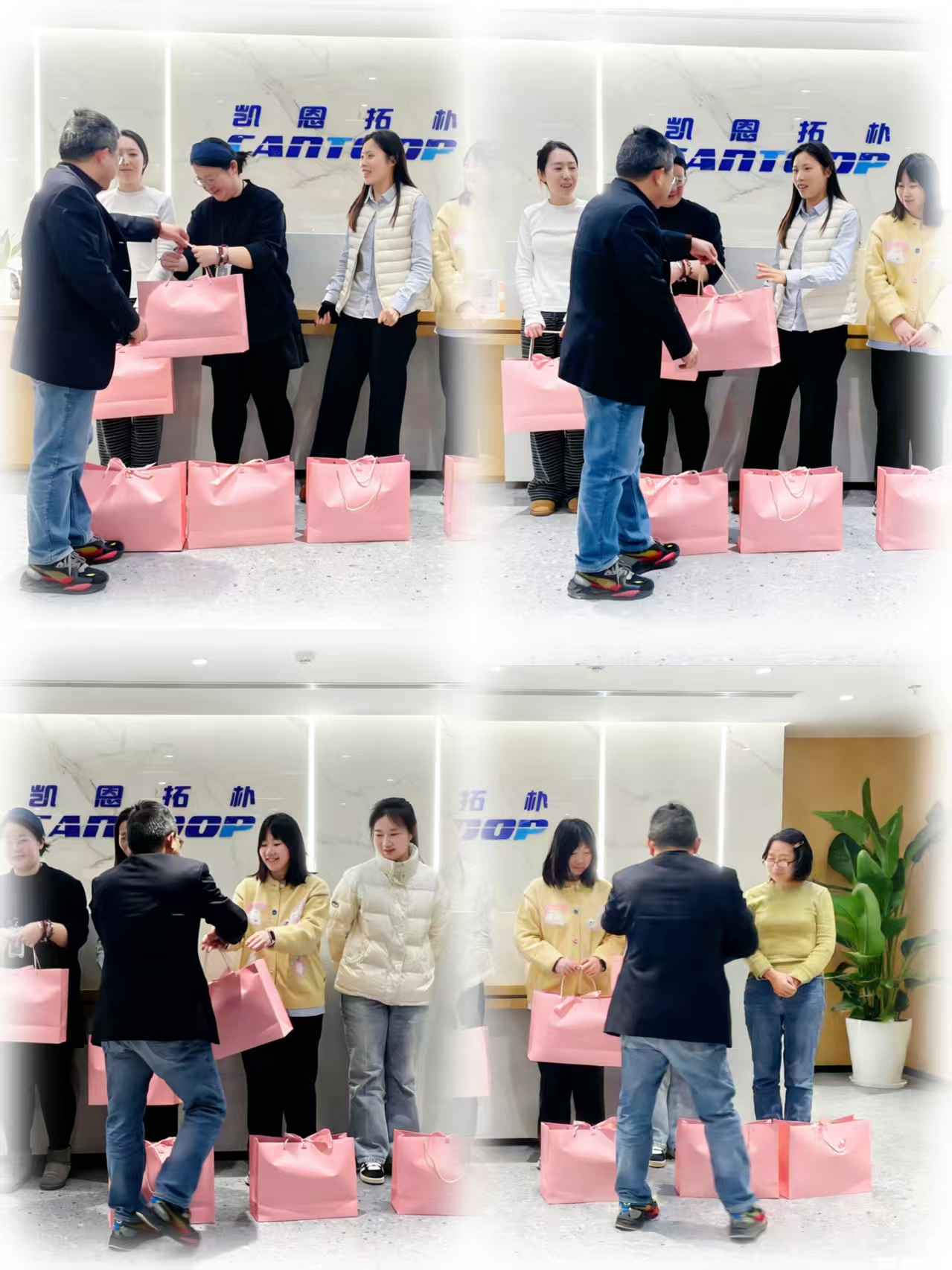 本周五,一份份精心挑选的节日礼物由凯恩拓朴公司副总裁黄贵华先生送到每一位女员工手中,实用的生活好物承载着公司对女员工的深切关怀与美好祝愿。收到礼物的女员工们脸上洋溢着幸福的笑容。