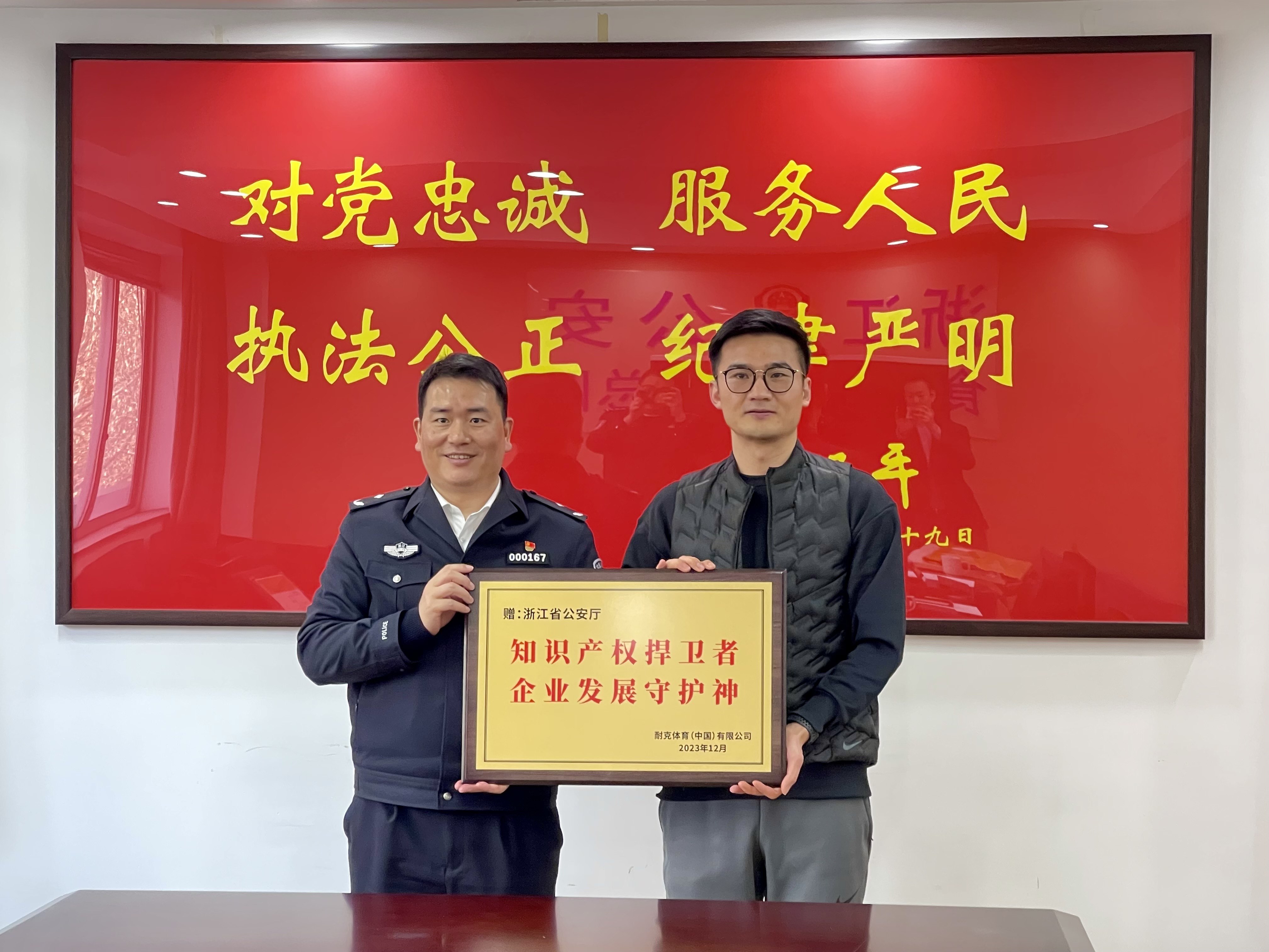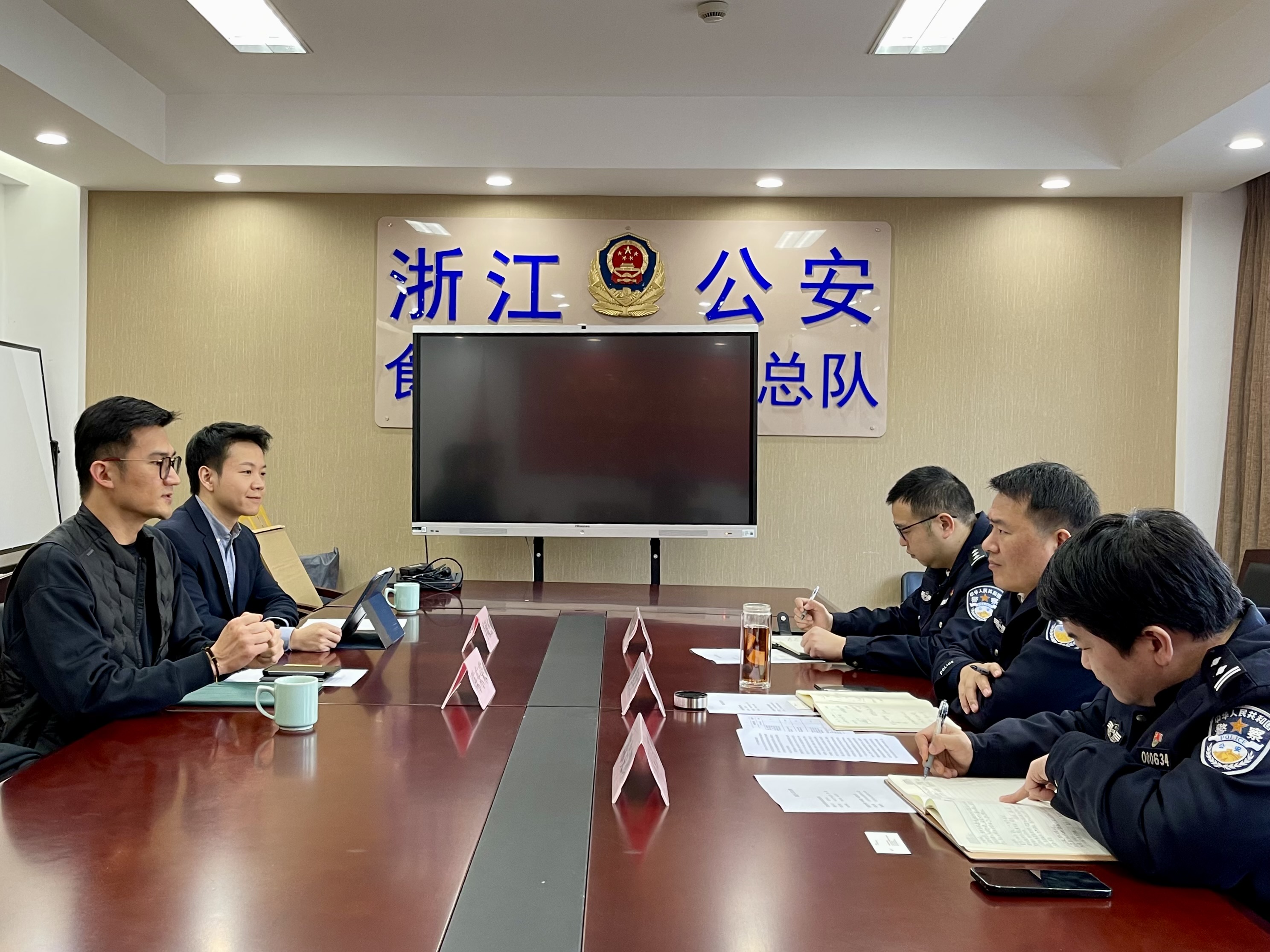 2024年1月4日,权利人代表——全球知名体育品牌公司大中华区品牌保护总监陈总前往浙江省公安厅食药环知总队进行拜访,再次对主办“1129”特大跨境生产、销售假冒注册商标商品案的浙江省台州市公安局路桥分局突出表现以及浙江省公安厅对该案的卓越指导与支持表达最诚挚的感谢,并就该案的打击成果、侦查进展等方面进行了交流。浙江省公安厅食药环知侦查总队盛洪卫总队长主持会议,并代表浙江省公安厅对权利人的到来表示欢迎,省厅食药环知侦查总队知识产权支队政委陈竞凯、综合室副主任朱泄风一同参加会议。