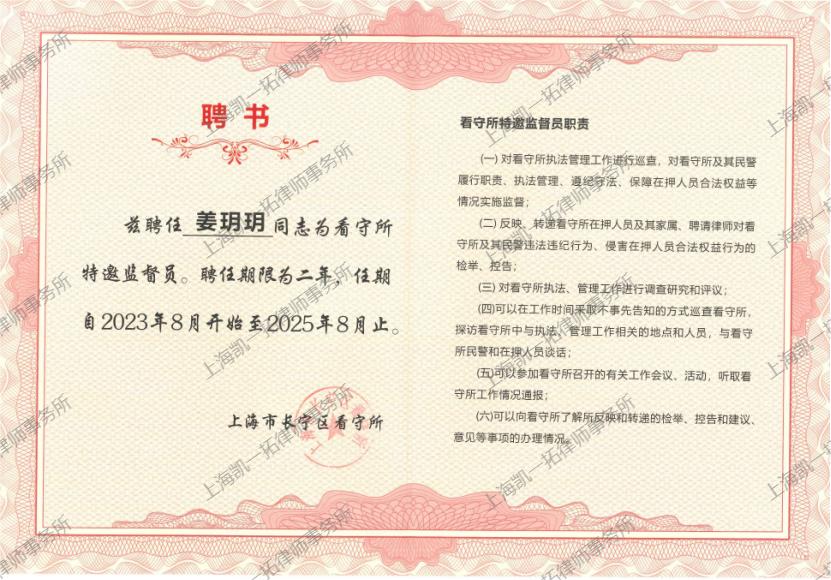 上海凯一拓律师事务所合伙人顾志献先生,凭借其卓越的专业素养和丰富的经验,近日被上海市公安局长宁分局聘为长宁分局党风政风警风监督员,同时被上海市长宁区看守所聘任为特邀监督员。顾志献先生将以其独特的视角和深入的洞察力,尽绵薄之力,为公安机关的党风政风警风建设和看守所的管理工作提供一些建议。